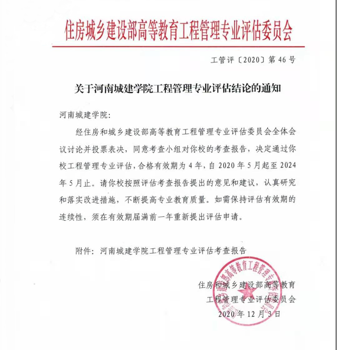 (通讯员 常小高)日前,接住建部高等教育工程管理专业评估委员会《关于太阳成tyc7111cc官网工程管理专业评估结论的通知》,公司工程管理专业继2016年首次评估通过之后,再次通过住建部高等教育专业评估,合格有效期为4年,自2020年5月起至2024年5月止。