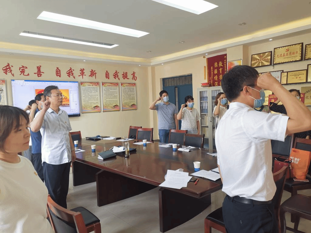 随后举行了重温入党誓词仪式,在支部书记马明龙的领誓下,全体党员佩戴党员徽章,面向党旗,举起右拳,庄严宣誓。“我志愿加入中国共产党,拥护党的纲领,遵守党的章程…”一字一句铿锵有力的誓词,震撼着每一位在场的党员。