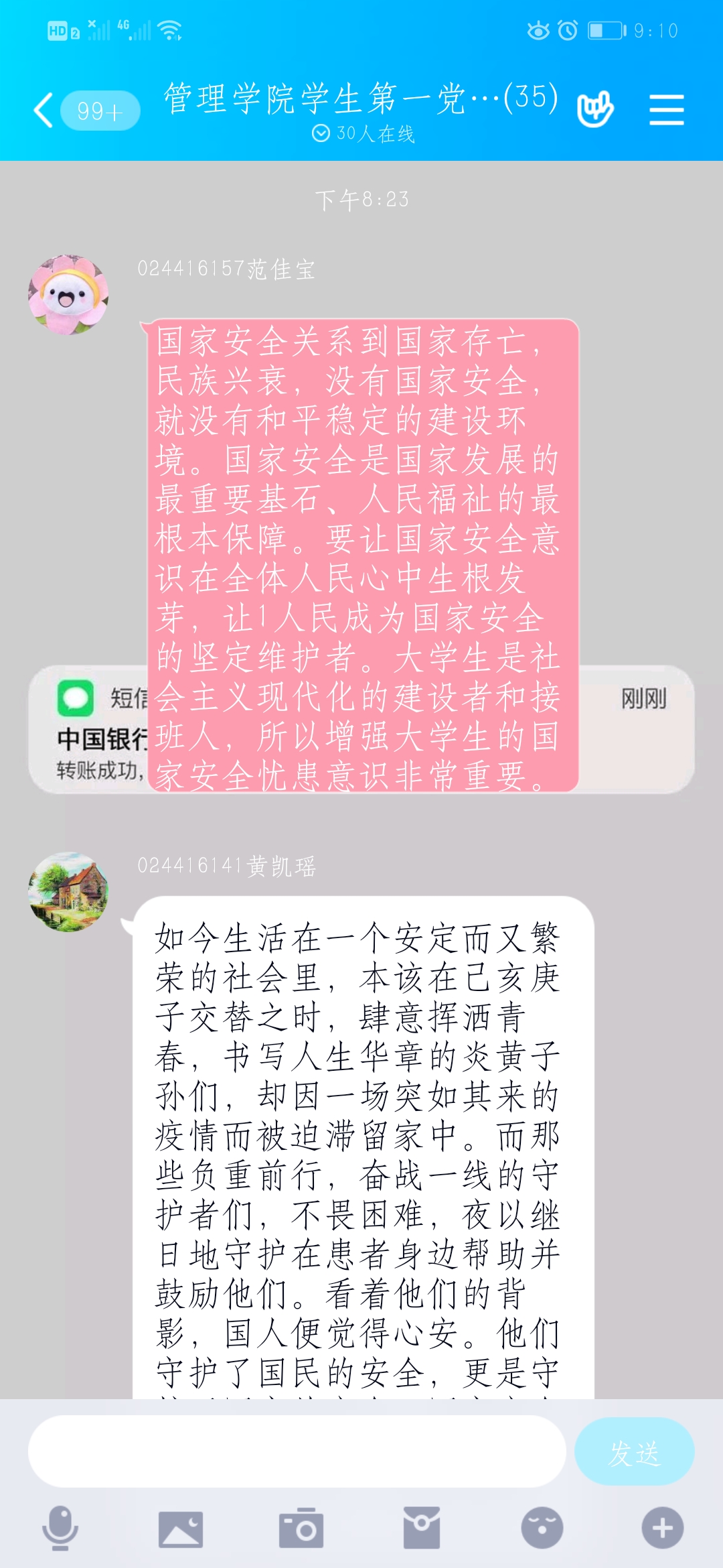 各支部克服疫情困难,积极采用线上方式组织党员集中学习国家安全知识。他们通过QQ、腾讯会议等平台进行网络视频会议、共同观看总体国家安全短视频,深入学习国家安全教育的重要意义,以及怎么维护国家安全。支部书记向党员们阐释了习近平总书记关于全面依法治国、坚持总体国家安全观的重要思想、重要指示,引导党员充分认识坚持总体国家安全观、维护国家安全的丰富内涵。