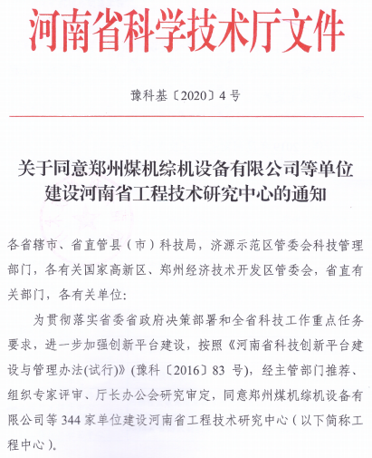 (通讯员:殷许鹏)近日,河南省科技厅下发《关于同意郑州煤机综机设备有限公司等单位建设河南省工程技术研究中心的通知》(豫科基〔2020〕4号),公司为依托单位申请的“河南省数字建造工程技术研究中心”获批建设。