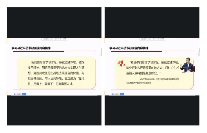 通过本次活动开展,习近平总书记重要回信精神充分传递到每个同学,同学们看到了习近平总书记对青年医务人员的肯定和鼓励,也认识到了青年一代作为国之栋梁所应肩负的责任。正如习近平总书记所说:“让青春在党和人民最需要的地方绽放绚丽之花。”总书记的回信也激励着同学们自强不息、努力奋进,坚定理想信念;以“不破楼兰终不还”的决心,以不畏艰险、冲锋在前的精神;努力成长为有理想、有本领、有担当的新时代社会主义建设者和接班人。