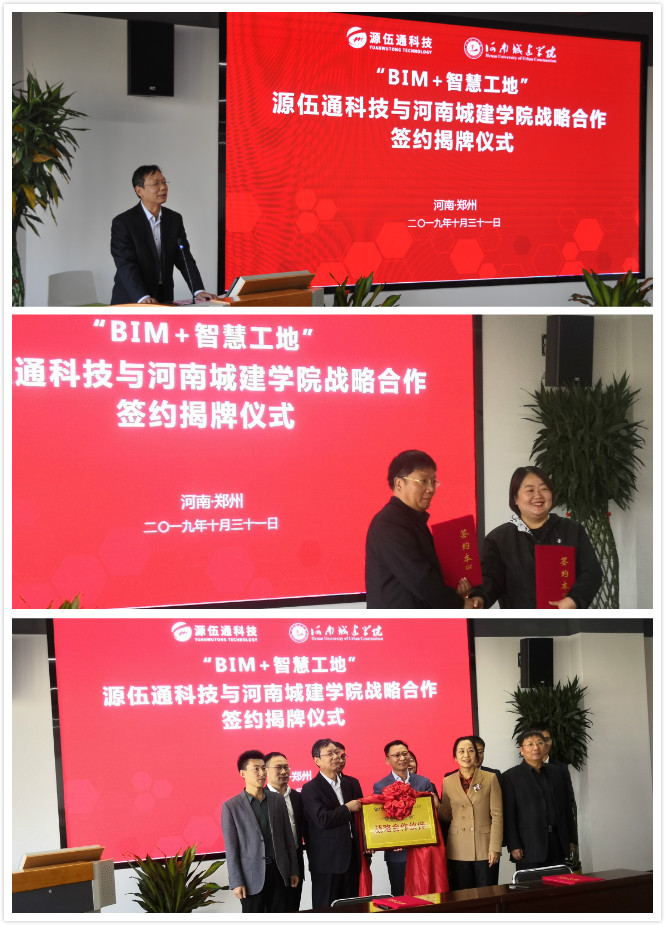 纪委书记刘守勇介绍了公司的发展历程、团队力量、特色专业和公司近些年来在BIM人才培养、员工比赛和社会服务的突出成绩,对河南省建筑业协会、源伍通科技积极推动公司行、企、校合作表示感谢。太阳成tyc7111cc官网闫瑾经理与源伍通科技刘斌斌副总经理代表各方签署了校企合作协议。李娟、刘守勇与胡斌共同为“BIM+智慧工地”战略合作揭牌。李娟秘书长对公司在“城建”类人才的培养取得的成绩高度评价,对公司为我省建筑业和社会经济发展做出的贡献给予高度赞扬,对本次行、企、校合作的内容和形式给予高度肯定。