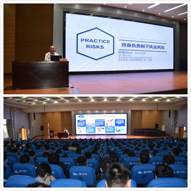 随后,何佰洲在行政楼报告厅向公司400余名师生开展了一场以“终身负责制下执业风险”为主题的讲座,通过鲜活的案例、严谨而又深邃的语言,向大家详细讲授了建设行业终身责任制、执业风险和法律责任的深刻内涵,赢得了在场师生的阵阵掌声,反响热烈。