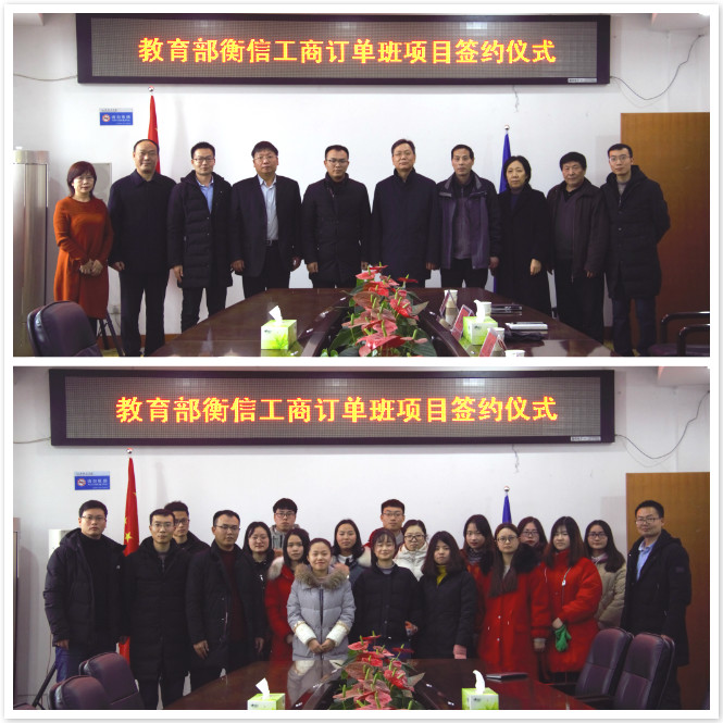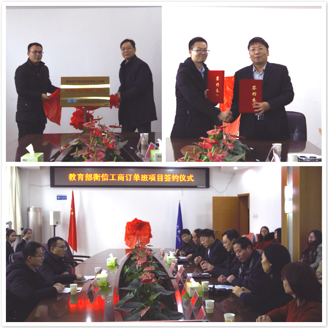 (通讯员:常小高)1月10日下午,公司在行政楼第一会议室隆重举办教育部衡信工商订单班项目签约仪式。校纪委书记刘守勇、公司党总支书记谢学明、经理闫瑾等相关领导和浙江衡信教育科技有限公司河南分公司副总经理缪一培、高级项目经理付克出席仪式,首批订单班20多名学员代表参加仪式。
