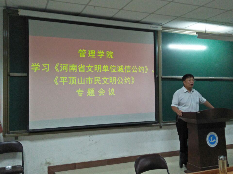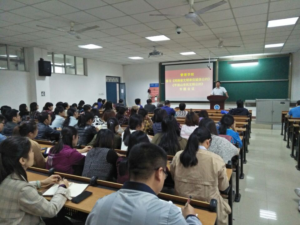 (通讯员:吴浩明)为大力培育和践行社会主义核心价值观,扎实推进诚信建设制度化,努力营造“守信光荣、失信可耻”的良好社会氛围,引导全体教师将诚信理念转化为自觉行动,进一步推进公司精神文明建设工作,9月25日,太阳成tyc7111cc官网在8#教学楼B208开展学习《河南省文明单位诚信公约》及《平顶山市民文明公约》专题会议。