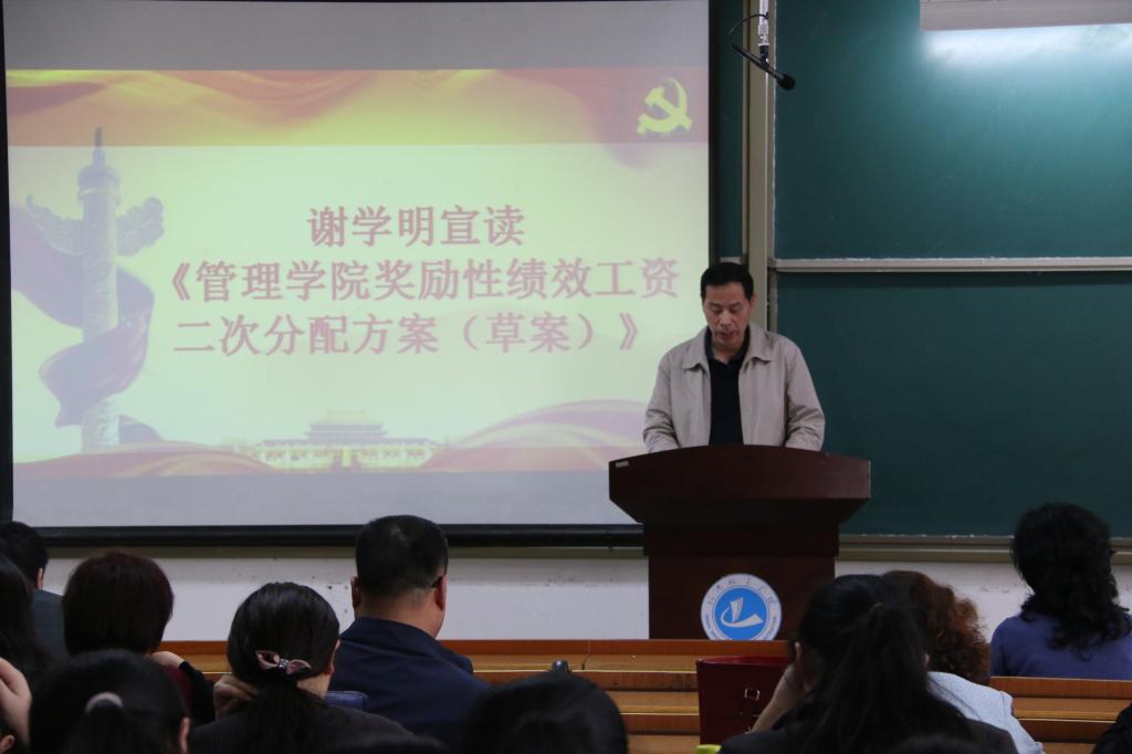 谢学明宣读《太阳成tyc7111cc官网奖励性绩效工资二次分配实施方案(草案)》