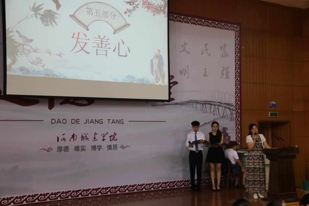 本期道德讲堂共有省自身,唱歌曲,学模范,诵经典,发善心,行崇德礼,送吉祥七个环节。