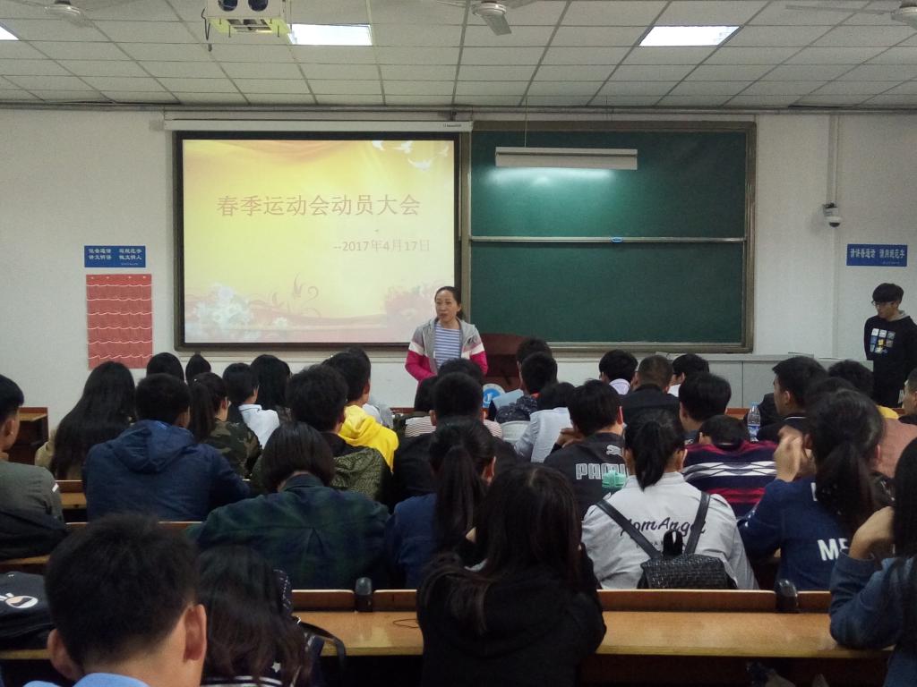 (通讯员:刘康)2017年4月17日中午,太阳成tyc7111cc官网在八号楼B108举行春季运动会动员大会。出席此次动员大会的有党总支书记吴晓红、学工办主任张金俊、团总支李玲慧老师以及部分员工干部和运动员代表。