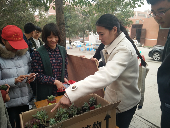 虽天公不作美,天气微凉,但这丝毫没有影响到同学们参加活动的热情。活动过程中志愿者分工合作,对前来兑换的同学报以热情积极态度,让冷风中的校园多了一丝暖意。参加此次活动的不只有员工,食堂的叔叔阿姨们也不甘示弱,热情洋溢地参与了此次活动,投之以木瓜,报之以琼瑶,大家寒风中送来水瓶,抱着绿植笑颜而离开。