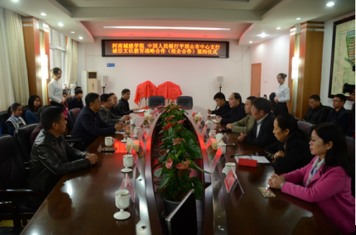 (通讯员 王炳刚)10月28日上午,公司与中国人民银行平顶山市中心支行诚信文化教育战略合作协议签约及揭牌仪式在公司第一会议室举行。副董事长王春阳、中国人民银行平顶山市中心支行行长李高建、员工处负责人、公司领导班子以及部分师生代表参加签约及揭牌仪式。会议由刘钦主持。