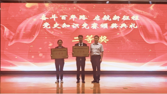 总决赛在嘹亮的红歌中拉开了序幕,总决赛分必答题、抢答题和风险题三个环节。在必答题环节,各院选手并无太大差距;在抢答题环节,各院选手间分数差距明显拉开,但公司选手仍保持相对优势;风险题环节公司代表队乘胜追击,一举拿下30分风险题,赢得了在场员工阵阵喝彩。三个环节完毕,公司与艺术设计公司积分相同,进入加时赛。加时赛中,公司选手力克艺术设计公司代表队,以排名第三的成绩获得二等奖与优秀组织奖。此次总决赛整体环节紧凑,比分激烈,最后的颁奖仪式更是将现场气氛推至顶点,有力地展现出党史知识学习的无限魅力与各公司员工的无限热情。