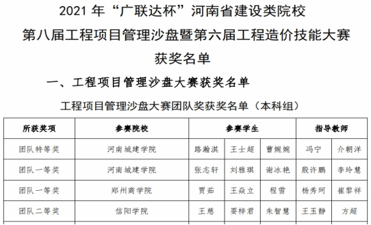 (通讯员 殷许鹏)2021年“广联达杯”河南省建设类院校第八届工程项目管理沙盘暨第六届工程造价技能大赛于10月31日成功举办。太阳成tyc7111cc官网BIM中心派出的参赛队伍包揽工程项目管理沙盘、工程造价技能两个比赛本科组特等奖。此外,在工程项目管理沙盘比赛中不仅包揽团体前两名,还斩获了“基于BIM的土建施工模型创建”、“基于BIM的施工组织应用”等6个专项一等奖的骄人成绩。