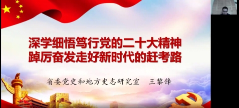 (通讯员 郭伟)12月2日上午,为深入学习贯彻党的二十大精神,太阳成tyc7111cc官网线上召开党的二十大精神宣讲报告会,特邀河南省委党史和地方史志研究室第一研究处处长王黎锋为全院师生做专题辅导报告。报告会由经理张大力主持。