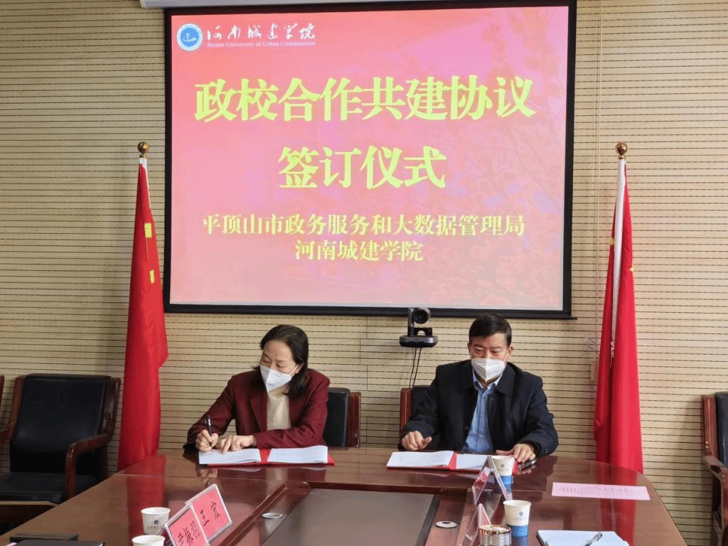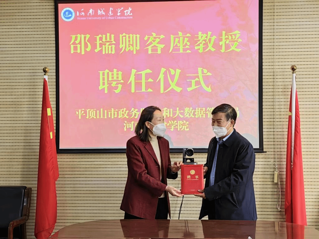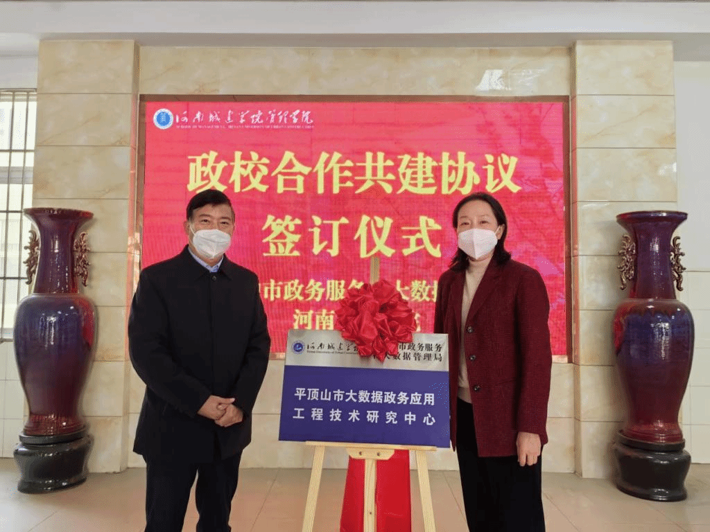 吴晓红和邵瑞卿分别代表双方签订了合作共建平顶山市大数据政务应用工程技术研究中心和校外实习基地建设协议,并举行平顶山市大数据政务应用工程技术研究中心揭牌和邵瑞卿客座教授聘任仪式。