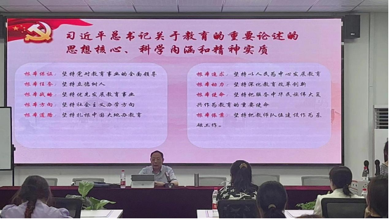 周颖杰围绕习近平总书记关于教育的重要论述,从习近平教育思想概述、加快建设教育强国、高等教育的高质量发展三个方面进行讲解。在讲解中,周颖杰着重强调习近平在全国教育大会上提出的“九个坚持”重要论述,阐述了习近平总书记关于教育的重要论述对社会主义教育总方向、总战略、总定位、总要求和总任务的战略部署。周颖杰强调,要贯彻落实习近平总书记关于教育强国建设的三个根本、重要使命、基本路径、核心功能和最终目标等方面的要求,大力加强学科专业建设,发挥好高等教育在教育强国建设中的龙头作用,以教育高质量发展为中国式现代化提供人才支撑。