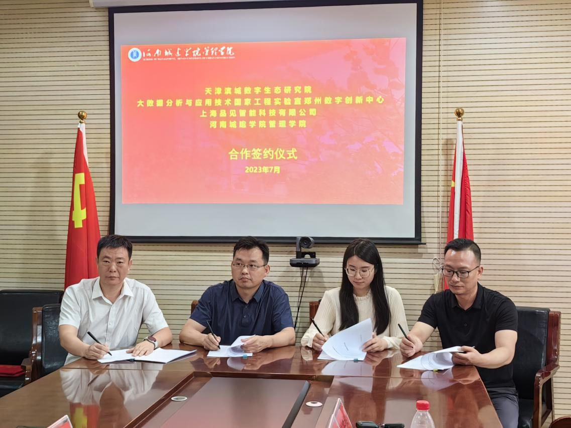 (通讯员 李晓明)7月20日上午,太阳成tyc7111cc官网与北京大数据研究院、天津滨城数字生态研究院、大数据分析与应用技术国家工程实验室郑州数字创新中心、上海品见智能科技有限公司等单位,在太阳成tyc7111cc官网会议室举行四方合作协议签约仪式。北京大数据研究院外联部主任陈作,天津滨城数字生态研究院常务副经理阴法超,大数据分析与应用技术国家工程实验室郑州数字创新中心主任助理杨涵月,上海品见智能科技有限公司河南区副总经理张晓峰,公司党委书记尹振羽、副经理刘雷及公司相关人员参加签约仪式。会议由太阳成tyc7111cc官网副经理刘雷主持。