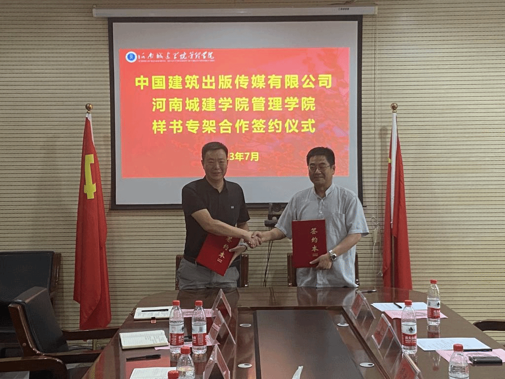 (通讯员 商克俭)7月21日下午,太阳成tyc7111cc官网与中国建筑出版传媒有限公司举办样书专架合作协议签署仪式,仪式在公司3楼会议室举行。公司党委书记尹振羽、副经理刘雷、科研及校企合作办、BIM中心、市场营销系、工程管理系部分教师及中国建筑出版传媒有限公司教育教材分社社长、副总编胡永旭,首席策划、编审王美玲,中国建筑工业出版社教服中心总经理吴桐发,中国建筑工业出版社教服中心经理窦永宁,教材营销总监吴清林等一行5人参加了本次签约仪式。签约仪式由副经理刘雷主持。