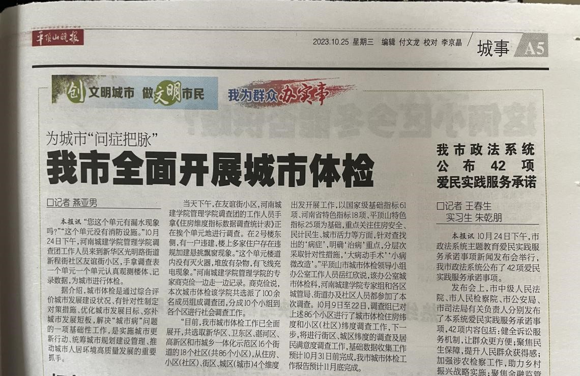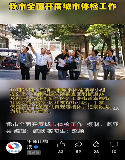 2.平顶山市晚报:《为城市“问症把脉”:我市全面开展城市体检工作》,https://www.pds.gov.cn/contents/45638/158579.html?security_verify_data=313336362c373638