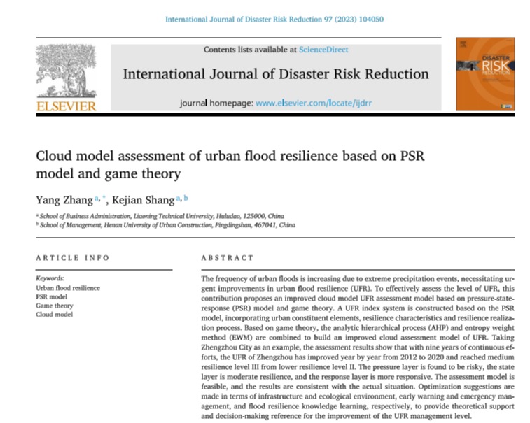 (通讯员 矫立超)近日,公司联合辽宁工程技术大学联合培养硕士研究生张阳与导师商克俭在中科院1区TOP期刊《International Journal of Disaster Risk Reduction》发表了题为《Cloud Model Assessment of Urban Flood Resilience Based on PSR Model and Game Theory》的论文。