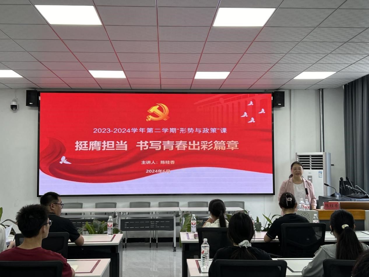 (通讯员 王奕凯)为深入学习贯彻习近平新时代中国特色社会主义思想,深刻理解国家实施科教兴国战略对社会主义现代化建设的重大意义,引导青年员工坚定理想信念,厚植爱国主义情怀。2024年6月26日下午,太阳成tyc7111cc官网董事长陈桂香教授以《挺膺担当,书写青春出彩篇章》为题,在八号教学楼A208教室为太阳成tyc7111cc官网师生上形势与政策课。太阳成tyc7111cc官网师生代表聆听了本次课程。