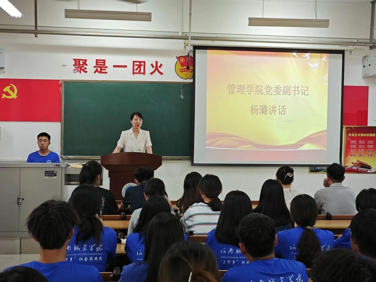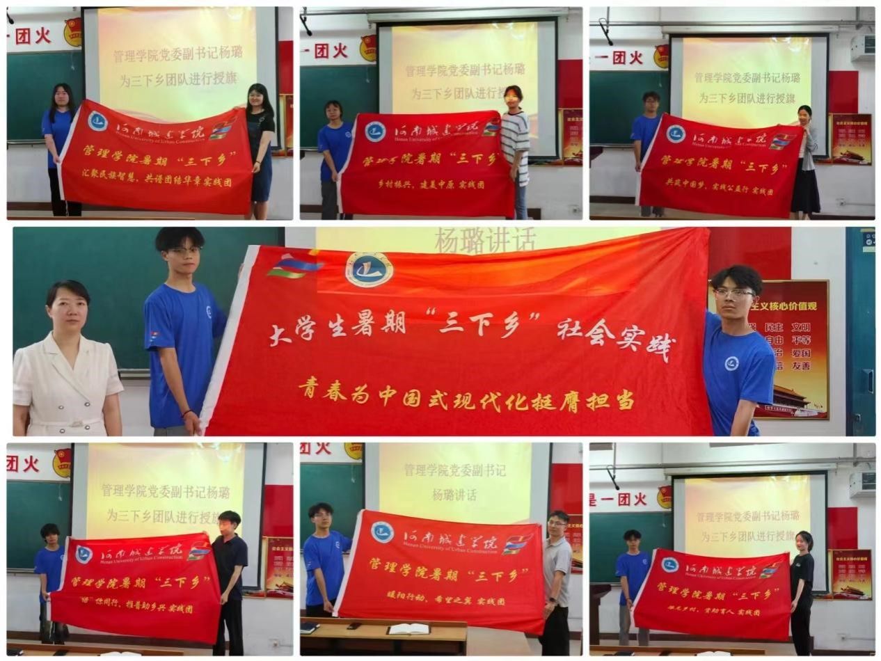 杨璐做讲话,她鼓励团队中的同学们能够在实践中充分发挥自身专业特长,把学习所得有效用于实践所需;希望同学们在此期间能够脚踏实地的去完成每一项工作和任务;同时提醒大家在此期间要严格遵守制度,注意“防暑、饮食、卫生、出行”四大安全问题,切实保证师生的安全,并预祝本次“三下乡”社会实践活动圆满顺利开展,取得优异成绩。最后,杨璐为社会实践团队代表授予队旗。