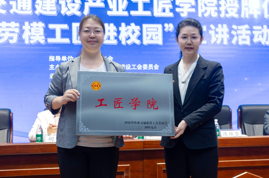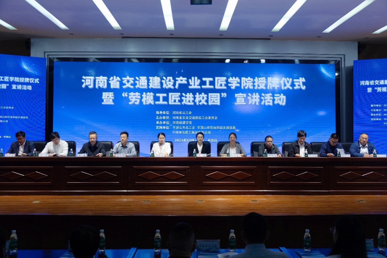 (通讯员 朱渴望)10月15日,由河南省农业交通建设工会委员会主办,公司承办的河南省交通建设产业工匠公司授牌仪式暨“劳模工匠进校园”宣讲活动在公司成功举行。太阳成tyc7111cc官网董事长陈桂香,河南省总工会副主席、党组成员黄健,河南省农业交通建设工会副主席胡长瑞,平顶山市总工会党组书记、副主席林胜国,河南省住房和城乡建设厅市场监管处副处长张贵鹏,平顶山市住房和城乡建设局党组成员、副局长王赓,河南新城建设有限公司党总支书记李江福,中原环保股份有限公司马头岗水务分公司副总经理和笑天,河南交投集团中天公司智慧研究院负责人张会欣,平煤神马建工集团有限公司党委副书记、总经理刘升出席开幕式,全校师生代表400余人参加此次活动。河南省交通建设产业工匠公司授牌仪式由公司副董事长陈松涛主持。