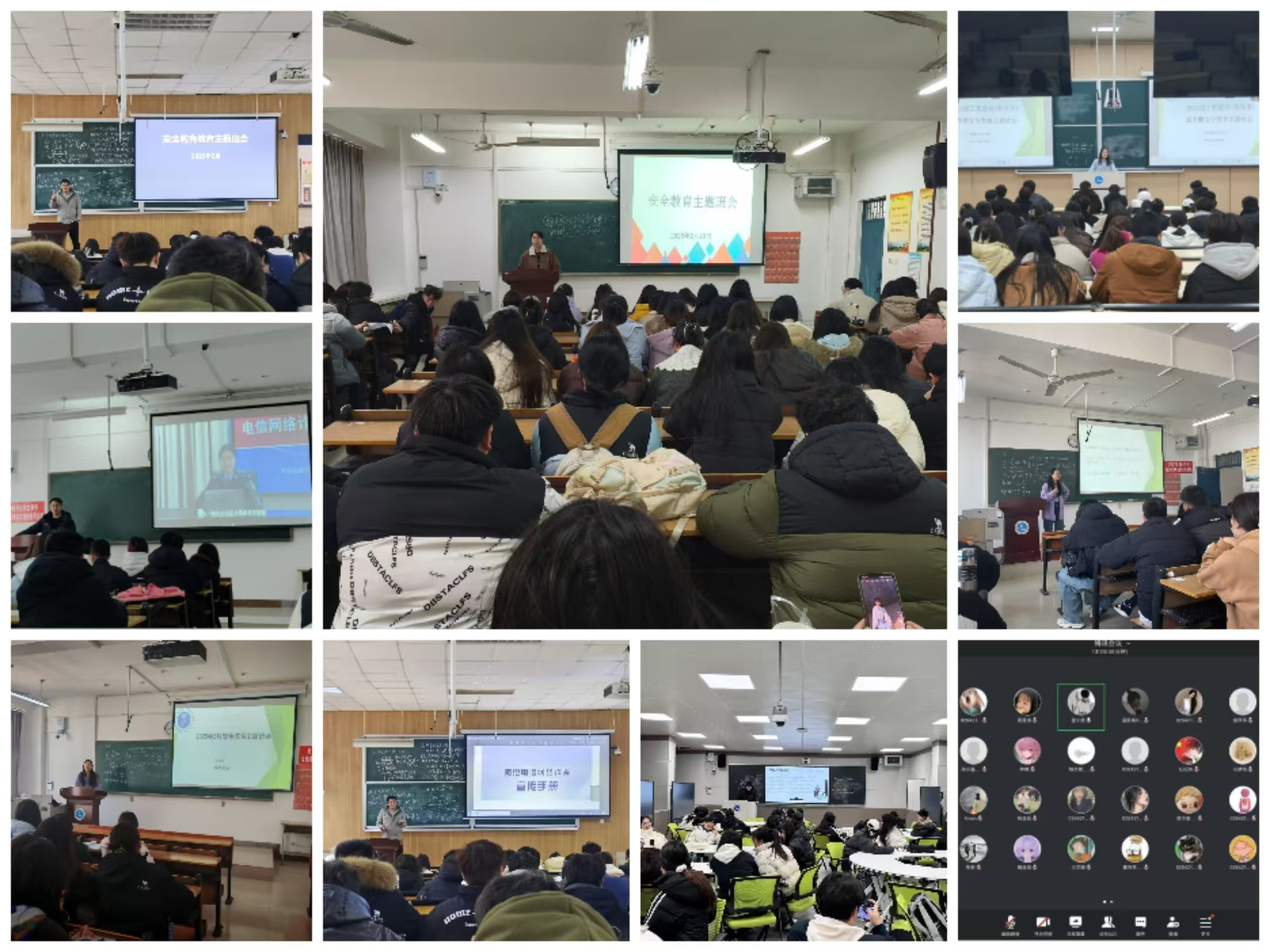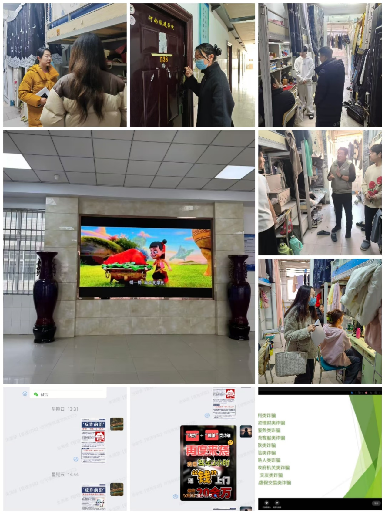 会后,辅导员老师们结合班级实际情况,围绕“交通安全、消防安全”、“网络诈骗”等主题开展多种形式的主题班会。辅导员深入员工宿舍检查有无违禁用品,提醒员工安全用电,切勿在宿舍抽烟。在太阳成tyc7111cc官网一楼大厅电子屏幕上循环播放安全和防诈骗教育视频,多方面提醒员工在校注意安全。
