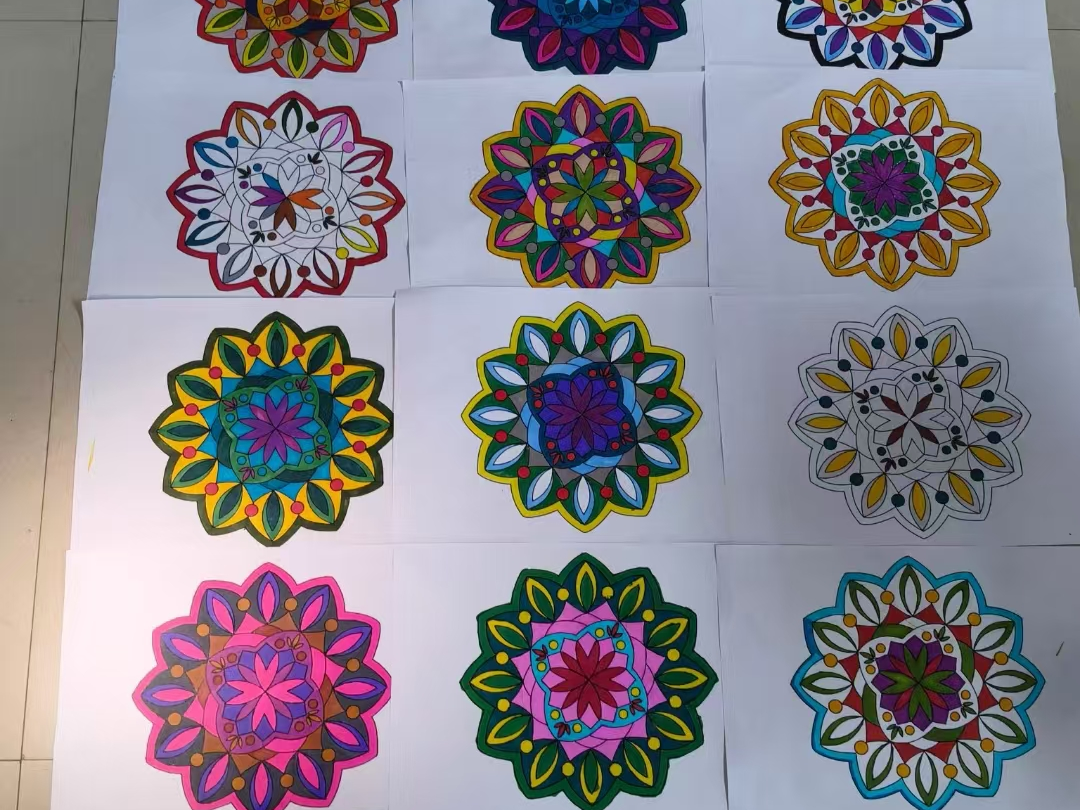 活动伊始,心理部门负责人通过生动的讲解,为同学们揭开了曼陀罗绘画的神秘面纱,详细阐释了其在心理学领域的独特价值与情绪调节功效。伴随着悠扬的轻音乐,现场很快沉浸在创作的氛围中。同学们专注地挑选心仪的彩笔,在精美的曼陀罗模板上尽情挥洒创意。笔尖游走间,紧张的情绪得以释放,专注的心流体验让每个人都找到了内心的平静。参与活动的员工分享道,“绘画时那种全神贯注的感觉很特别,当色彩在纸上流淌,烦恼似乎也随之消散,这种表达方式让我学会用更柔和的方式对待自己的情绪。”她的话语引起在场同学的共鸣,大家纷纷点头表示认同。