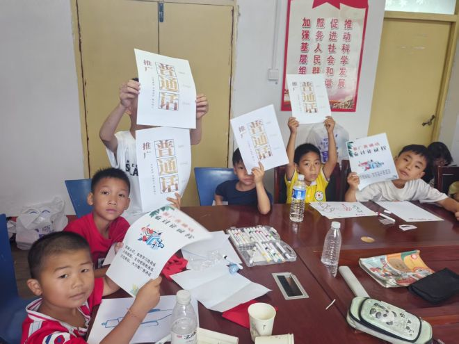 为孩子们发放推普海报