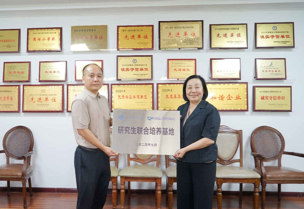 仪式上,毛艳丽向河南驰远工程管理有限公司授予“研究生联合培养基地”牌匾,双方共同签订了校企合作框架协议、研究生联合培养协议。