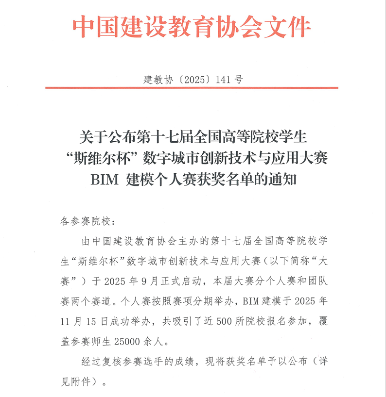 (通讯员 朱渴望)近日,由中国建设教育协会主办的第十七届全国高等院校员工“斯维尔杯” 数字城市创新技术与应用大赛圆满落幕。太阳成tyc7111cc官网城建BIM 竞技社学子凭借扎实的专业功底、创新的技术应用与默契的团队协作,在全国众多参赛队伍中脱颖而出,一举斩获30 项奖项,充分彰显了公司在 BIM 技术人才培养领域的深厚积淀与显著成效。